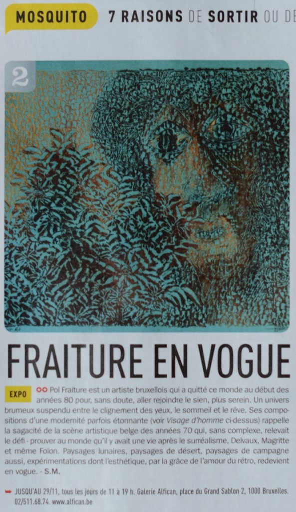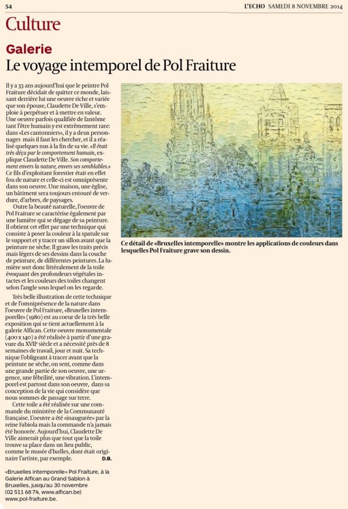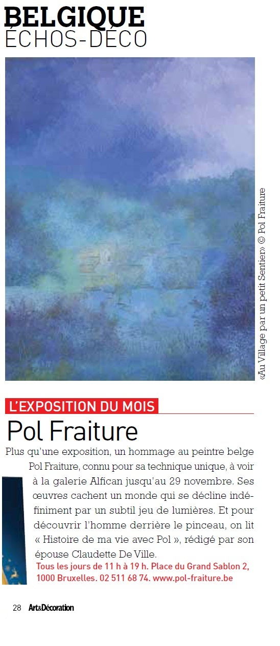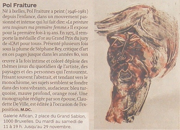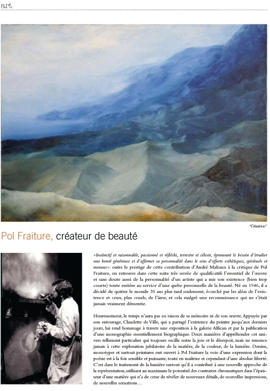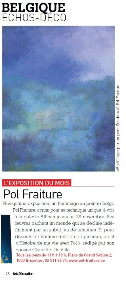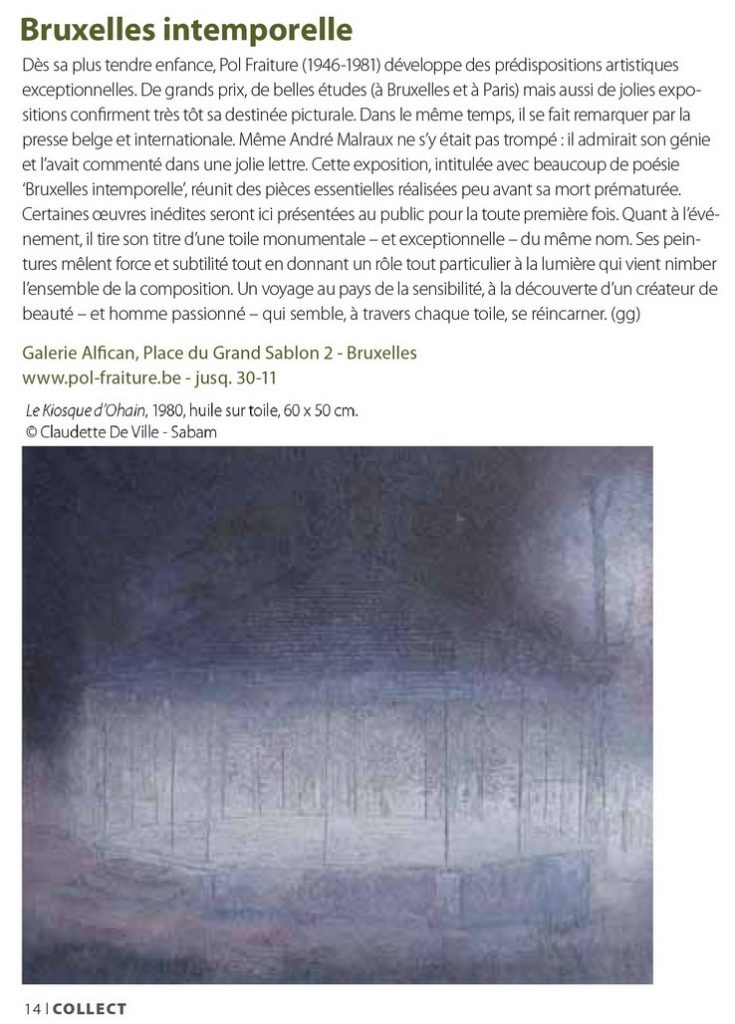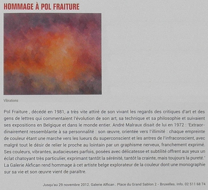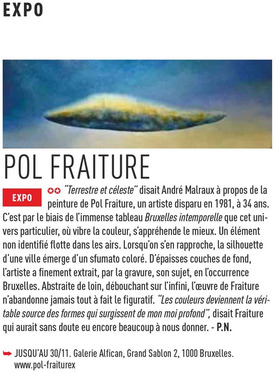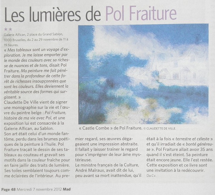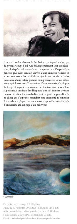 Pol Fraiture, créateur de beauté «Instinctif et raisonnable, passionné et réfléchi, terrestre et céleste, éprouvant le besoin d’irradier une bonté généreuse et d’affirmer sa personnalité dans le sens d’efforts esthétiques, spirituels et moraux»: outre le prestige de cette contribution d’André Malraux à la critique de Pol Fraiture, on retrouve dans cette suite très serrée de qualificatifs l’essentiel de l’œuvre et sans doute aussi de la personnalité d’un artiste qui a mis son existence (bien trop courte) toute entière au service d’une quête personnelle de la beauté. Né en 1946, il a décidé de quitter le monde 35 ans plus tard seulement, écorché par les aléas de l’existence et ceux, plus cruels, de l’âme, et cela malgré une reconnaissance qui ne s’était jamais vraiment démentie. Heureusement, le temps n’aura pas eu raison de sa mémoire ni de son œuvre. Appuyée par son entourage, Claudette de Ville, qui a partagé l’existence du peintre jusqu’aux derniers jours, lui rend hommage à travers une exposition à la galerie Alfican et par la publication d’une monographie essentiellement biographique. Deux manières d’appréhender cet univers tellement particulier qui toujours oscille entre la joie et le désespoir, mais ne renonce jamais à cette exploration jubilatoire de la matière, de la couleur, de la lumière. Dessins, monotypes et surtout peintures ont ouvert à Pol Fraiture la voie d’une expression dont la poésie est à la fois sensible et puissante, toute en maîtrise et cependant d’une absolue liberté. C’est dans le traitement de la lumière surtout qu’il a contribué à une nouvelle approche de la représentation, utilisant au maximum le potentiel des contrastes chromatiques dans l’épaisseur d’une matière qui n’a de cesse de révéler de nouveaux détails, de nouvelles impressions, de nouvelles sensations… Il est vrai que les tableaux de Pol Fraiture ne s’appréhendent pas du premier coup d’œil. Un éclairage pertinent leur est nécessaire, ainsi qu’un œil attentif et un rien perspicace. On peut alors pénétrer plus avant dans cet univers d’une immense richesse. Et en savourer toutes les subtilités, se réjouir avec lui de ces belles évocations d’une nature presque omniprésente ou de ces nébuleuses qui flirtent avec l’abstraction. L’homme semble la plupart du temps étranger à cet environnement, même si on y subodore sa présence. Sans doute les déceptions que Pol Fraiture a vécues ou ressenties face à ses semblables sont en partie responsables de ce choix qui s’exprime cependant sans animosité ni rancœur. Riante dans la plupart des cas, son œuvre possède cette étincelle d’universalité qui est gage d’un bel avenir. Didier Paternoster – L’Événement Art, novembre 2012